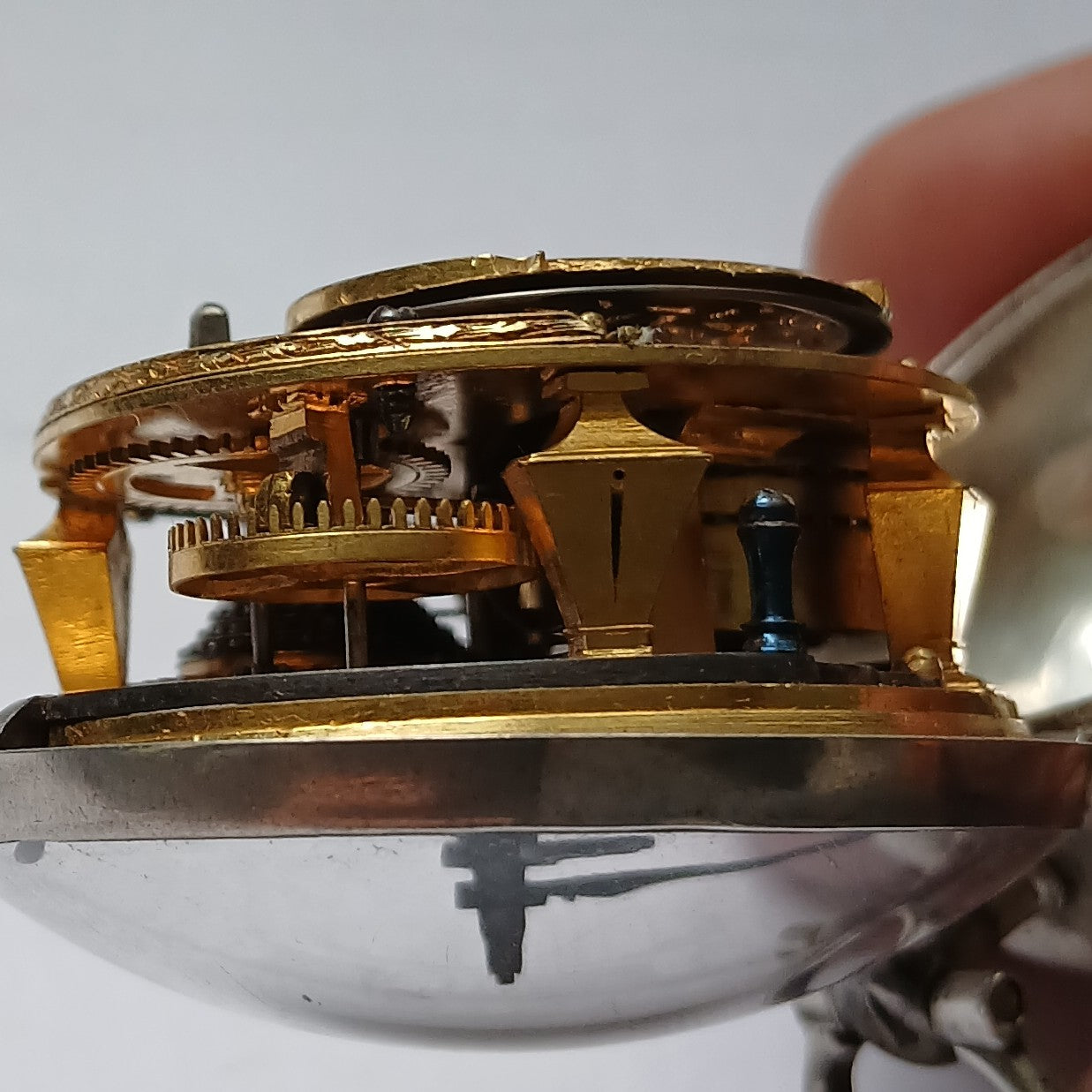 In good all round condition, clean champleve dial with a nice patina...original hands. fire gilded movement with heavy chain and fusee. running well and keeping reasonable time. some minor dents and bruising on outer case. nice original square hinge and wide bezel. getting harder to find in this original condition.